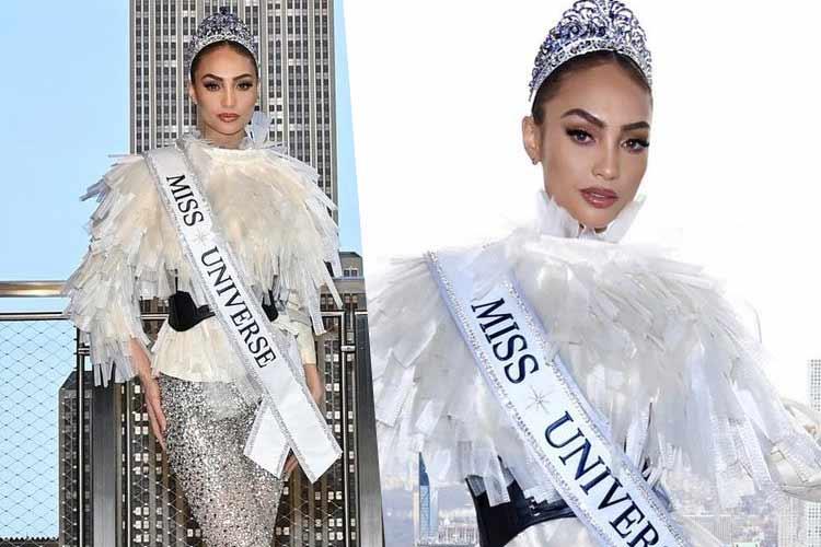 Miss Universe 2022 R’Bonney Gabriel wore Jovani and Rene Garza creation as she visited the Empire State Building. The frilly white top and the sequined pants looked absolutely stunning in the outfit and was accompanied by Olivia Quido and Anne Jakrajutatip.